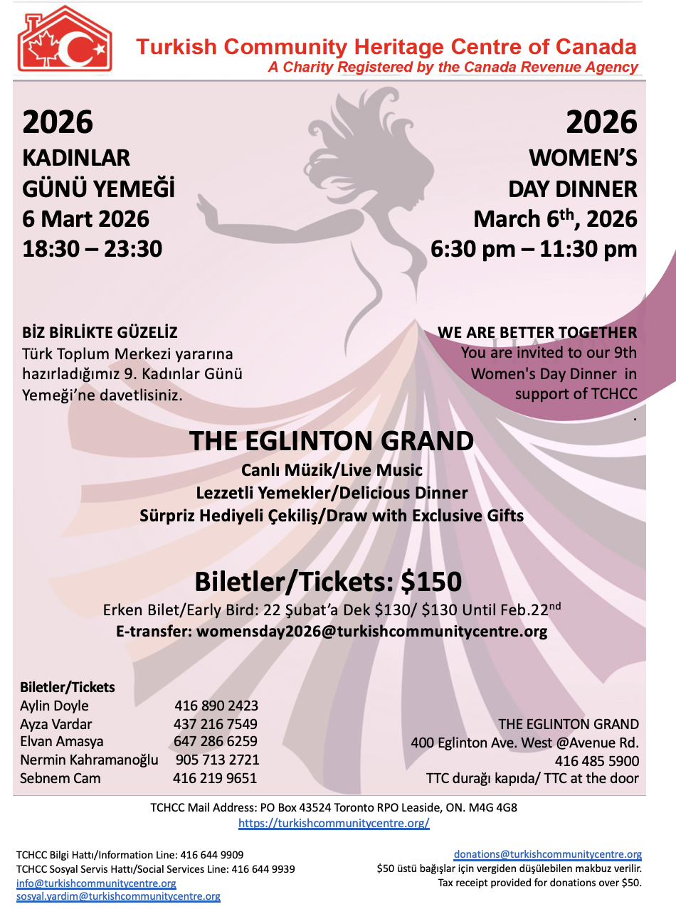 Gönüllülerinin büyük çoğunluğu kadınlardan oluşan Türk Toplum Merkezi yararına düzenlenen 9. Kadınlar Günü Yemeği, 6 Mart 2026 Cuma akşamı 18:30–23:30 saatleri arasında, Toronto’nun en güzel salonlarından The Eglinton Grand’de gerçekleşecek. Canlı müzik, lezzetli yemekler ve sürpriz hediyeli çekilişlerle dolu bu özel gecede hep birlikte olmak, dayanışmayı büyütmek istiyoruz. Ne kadar çok olursak, o kadar güzel! […]