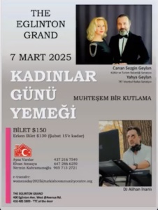Çoğu kadın gönüllülerden oluşan Kanada Türk Toplum Merkezi (Turkish Community Heritage Centre of Canada) Kadınlar Günü için her sene kaynak geliştirme yemeği düzenliyor. Kadınlara özel bu gecede çocuklara beyler bakıyor. Canlı müzik, nefis yemekler ve sürpriz çekilişler…